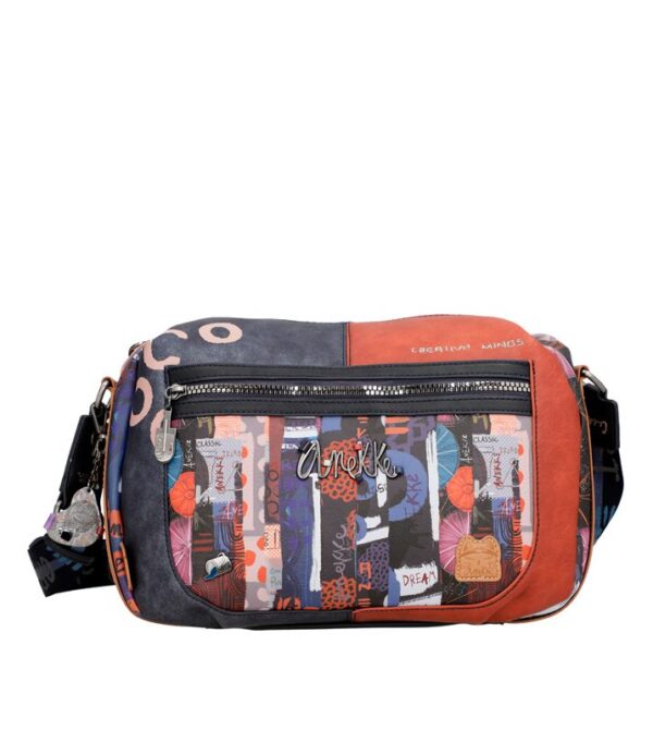 Bandolera de la colección Anekke Kyomu. Anekke Kyomu es una colección formada por el estampado por un lado de Anekke Contemporary, que junto con un bolsillo frontal en tonos caldera, crean piezas muy combinables y coloridas, conservando toda la esencia de Anekke. En las piezas de la colección podemos encontrar palabras como Dream, Inspire, o Creativity. Elementos gráficos que nos recuerdan a manchas de pintura o símbolos japoneses. Pespuntes, acabados naturales, y pasados. Cadenas y elementos metálicos. Además el pin de towanda con brochas a tono.