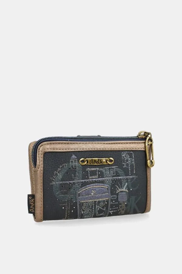 El diseño exterior de este billetero es una verdadera invitación a la imaginación, inspirándose en la estética de una fachada con un portal misterioso y sofisticado. La parte frontal principal presenta un estampado detallado en tonos azul marino, grises y ocres que recrea la entrada a un edificio elegante, con un árbol y otros elementos arquitectónicos, transmitiendo una sensación de arte y romanticismo. Los toques metálicos en tono bronce envejecido, presentes en el tirador de la cremallera y en el cierre de la lengüeta, realzan la estética general y le confieren un aire vintage. En la parte trasera, el billetero luce un elegante estampado con las palabras «Anekke» y otros motivos de la colección, haciendo de cada detalle una declaración de estilo. Como es sello de la subcolección Boutique, se presta una atención meticulosa a cada acabado, un guiño constante a la creatividad y al cuidado artesanal.
