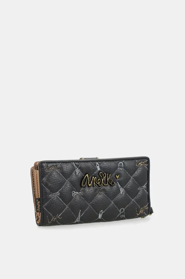 Una de las características más destacadas de este billetero es su asa de muñeca extraíble, que te permite llevarlo cómodamente en la mano, transformándolo en un pequeño clutch para esos momentos en los que prefieres salir solo con lo esencial. Las imágenes muestran cómo esta asa, en el mismo tono azul marino del billetero, se integra a la perfección con el diseño general. El exterior combina texturas de forma magistral: la parte frontal principal presenta un elegante acolchado en tono azul marino con sutiles bordados que evocan la Torre Eiffel y otros iconos parisinos, añadiendo un toque chic y cosmopolita. La parte inferior, en un tono beige con efecto texturizado, aporta contraste y sofisticación. La solapa, en azul marino con el logo de Anekke en relieve dorado, es un sello distintivo de la marca.
