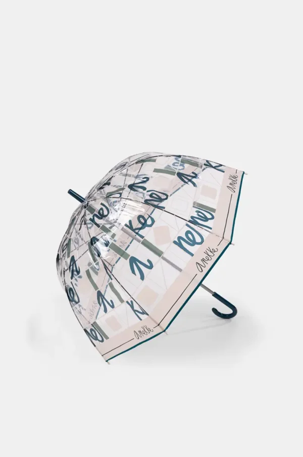 El paraguas vinilo largo Anekke Logo es un homenaje a la esencia minimalista y elegante de la marca. Su copa transparente permite disfrutar de la visibilidad y la luz mientras te protege de la lluvia, convirtiendo cada día gris en una oportunidad para brillar. El diseño presenta el nombre «Anekke» en un elegante cursive turquesa oscuro, acompañado de formas abstractas en tonos beige, creando un contraste sofisticado y moderno.