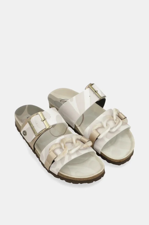 En las imágenes se aprecia una silueta limpia y favorecedora, pensada para acompañarte en el día a día sin renunciar al estilo. La pala trasera incorpora una hebilla personalizada ajustable, ideal para adaptar mejor la sandalia al pie y conseguir una pisada más cómoda. La parte delantera, más ancha, recoge el empeine con un detalle decorativo de eslabones en tono marfil que suaviza el conjunto y aporta ese toque distintivo que hace que no parezcan unas sandalias bio más.